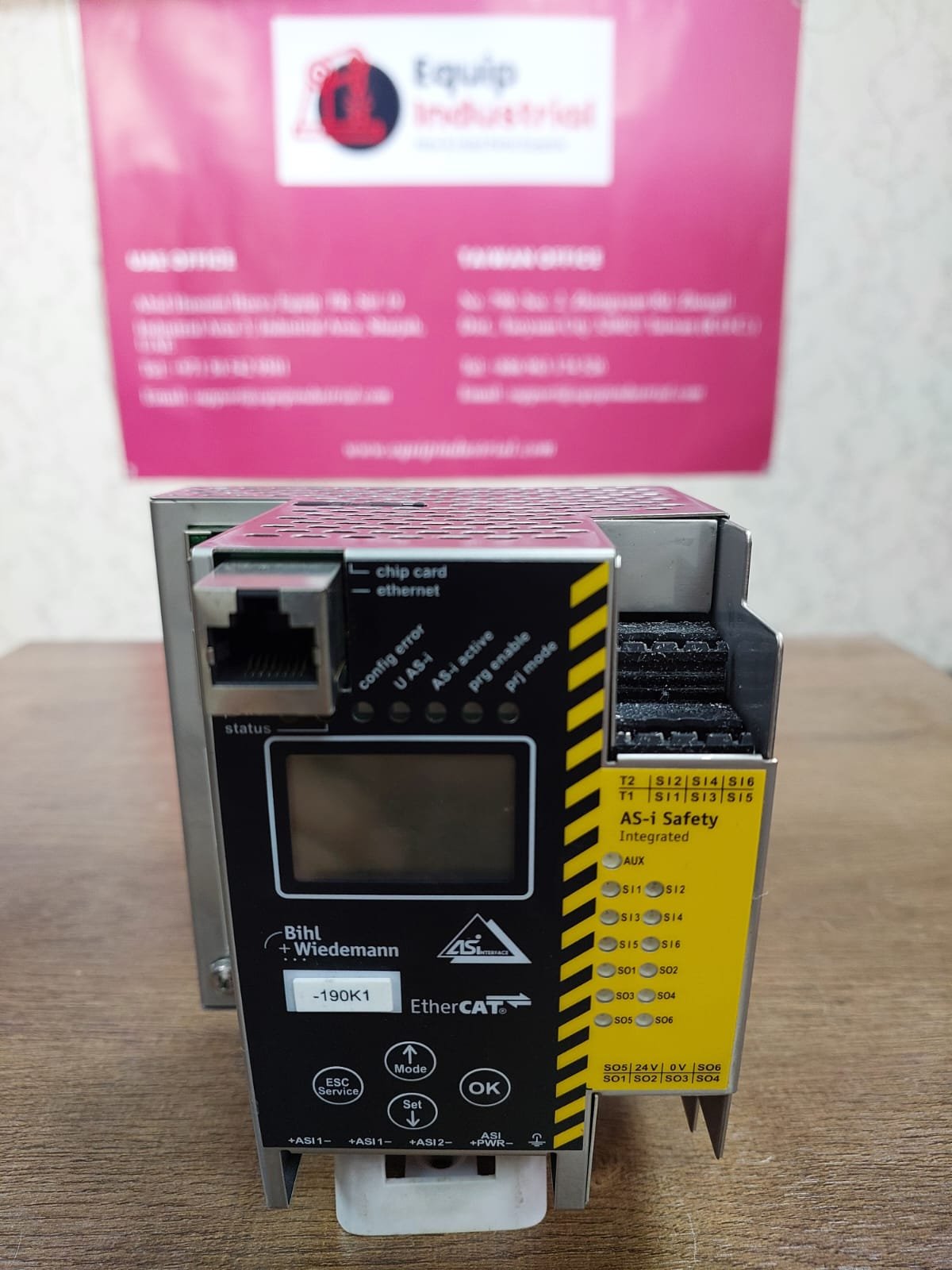 Ensure top-tier industrial safety with the Bihl+Wiedemann AS-i Safety Monitor, designed for seamless safety monitoring and control in automation systems. Featuring EtherCAT communication, this advanced safety controller enables fast and reliable integration with industrial networks, ensuring fail-safe operation and real-time diagnostics.”